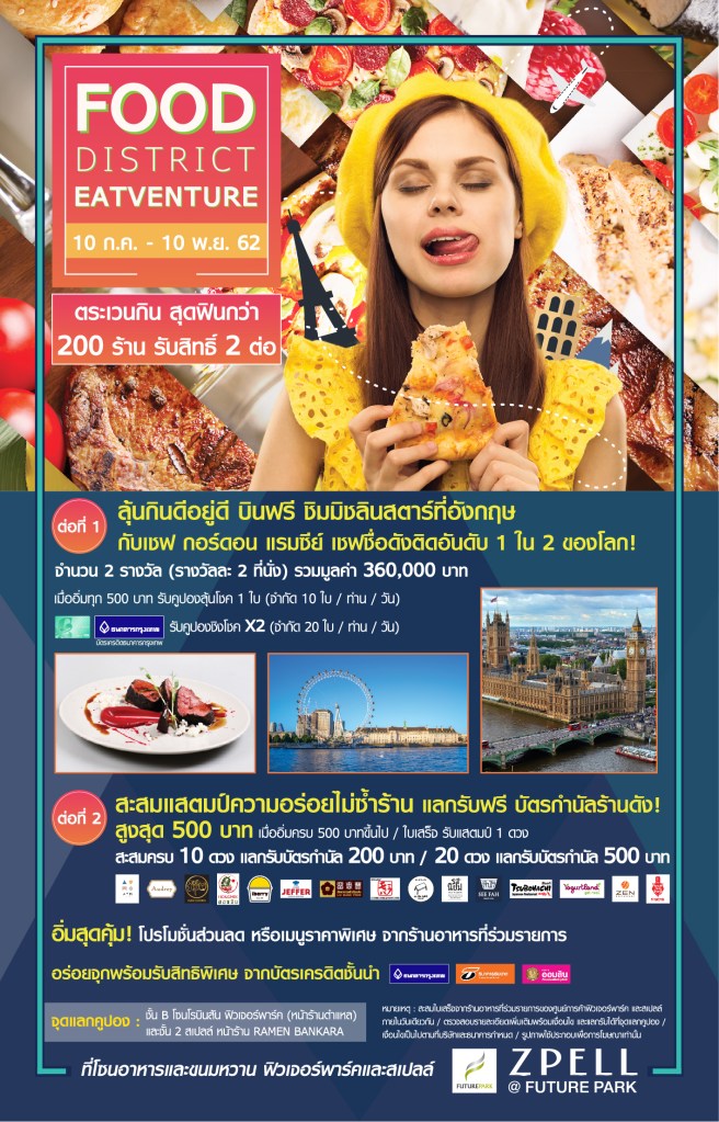“Food District Eatventure” ตระเวนกินสุดฟิน กว่า 200 ร้านอาหารในฟิวเจอร์พาร์ค และสเปลล์ พร้อมรับสิทธิ์ ลุ้นบินลัดฟ้าชิมอาหารระดับมิชลินสตาร์ กับเชฟ กอร์ดอน แรมซีย์ เชฟชื่อดังติดอันดับ 1 ใน 2 ของโลก! ที่ประเทศอังกฤษ มูลค่ากว่า 360,000 บาท และสะสมแสตมป์ความอร่อย รับ Gift Voucher สูงสุด 500 บาท