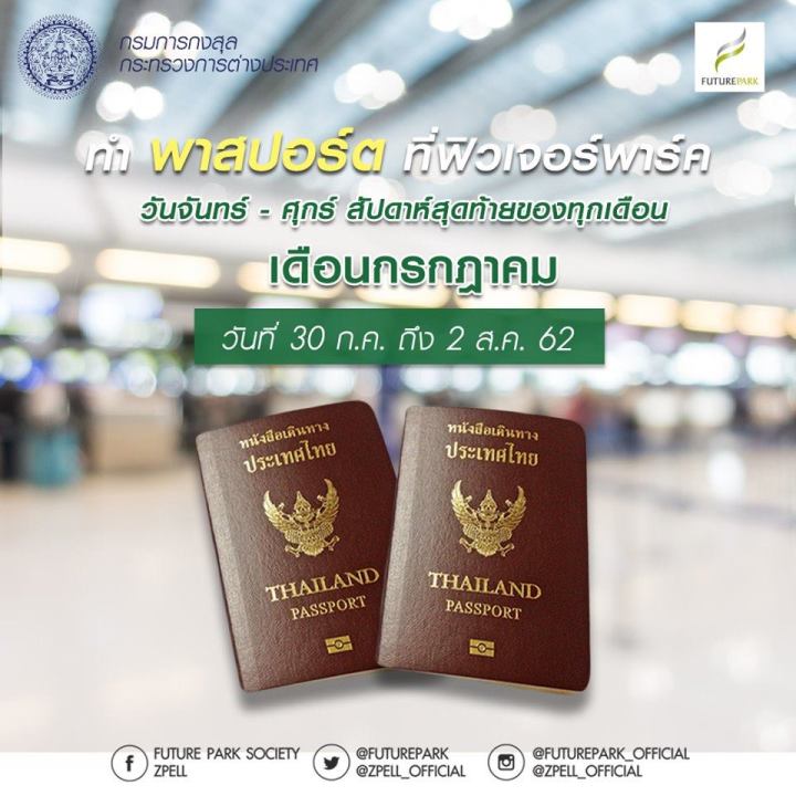 ข่าวดีสำหรับใครที่ต้องการทำพาสปอร์ต ไม่ต้องไปถึงกรมการกงสุล กระทรวงการต่างประเทศแล้วนะ วันที่ 30 กรกฎาคม ถึง 2 สิงหาคม 2562 นี้สามารถทำได้ที่ ฟิวเจอร์พาร์ค รังสิต ณ ศูนย์บริการภาครัฐแบบเบ็ดเสร็จ บริเวณชั้น 3 โซนเซ็นทรัล ฟิวเจอร์พาร์ค เปิดให้บริการตั้งแต่ วันที่ 30 กรกฎาคม ถึง 2 สิงหาคม 2562 ให้บริการตั้งแต่เวลา 11:00 น. เป็นต้นไป (จำกัด 200 คิว/ต่อวัน)