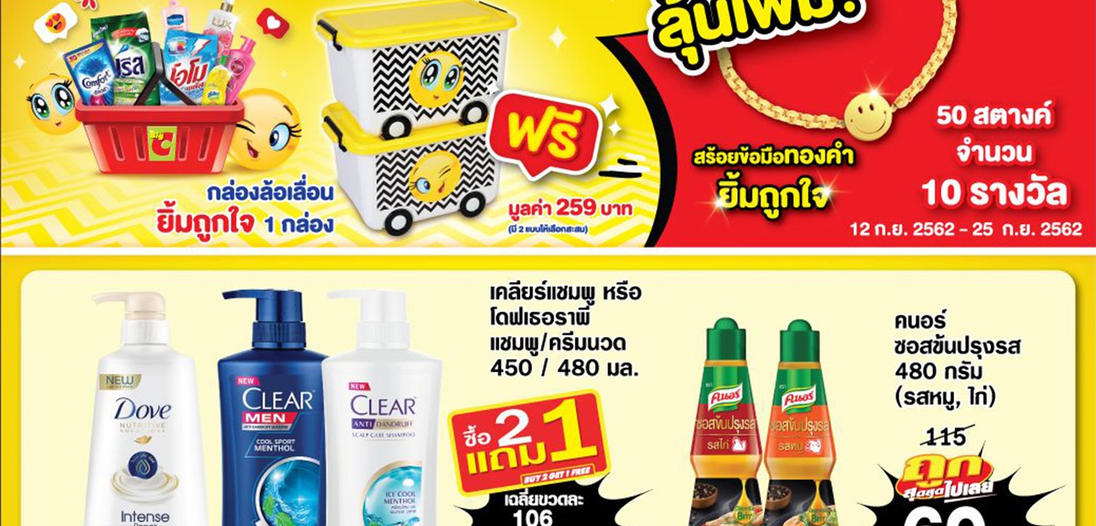 บิ๊กซี ยิ้มถูกใจ เพราะว่าช้อปถูกจริง สินค้าลดราคาถูกสุดๆ พร้อมรับกล่องล้อเลื่อนยิ้มถูกใจ มูลค่า 259 บาทไปเลย เมื่อซื้อสินค้าในเครือยูนิลีเวอร์ครบ 399 บาท พิเศษอีกต่อ ลุ้นทองคำหนัก 50 สตางค์อีก 10 รางวัล!! ตั้งแต่ 12 – 25 ก.ย. 62 ที่บิ๊กซี