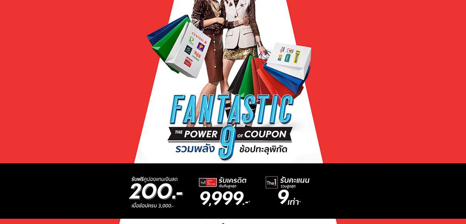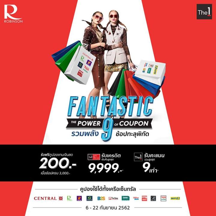 พลังแห่งการช้อปปะทุขึ้นแล้ว FANTASTIC The Power 9 of Coupon รวมพลังช้อปทะลุพิกัดทั้งเครือเซ็นทรัล กับโปรดีที่ต้องรีบหิ้ว… รับฟรี! คูปองแทนเงินสด 200 บาท เมื่อช้อป 3,000 บาท*, รับเครดิตเงินคืนสูงสุด 9,999 บาท* เมื่อช้อปผ่านบัตรเครดิต เซ็นทรัล เดอะวัน, รับคะแนน เดอะวัน รวมสูงสุด 9 เท่า* เริ่ม 6-22 กันยายน 2562 ที่ศูนย์การค้าและร้านค้าที่ร่วมรายการ