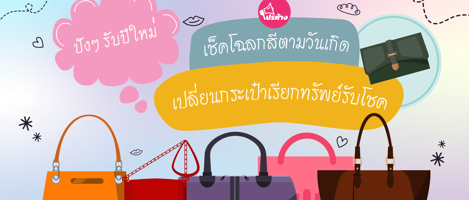 ปีใหม่แล้วก็ต้องมีอะไรใหม่ๆ เสริมดวงกันหน่อยจริงไหมค่ะสาวๆ วันนี้ โปรห้าง เลยจัดให้ สายมูทั้งหลายได้เวลารับโชค รับปีหนูทองกันแล้ว กระเป๋าใบใหม่เสริมดวงด้วยสีถูกโฉลกตามวันเกิดของคุณ และยังมีเคล็ดลับเรียกทรัพย์มาฝากด้วยนะคะ
