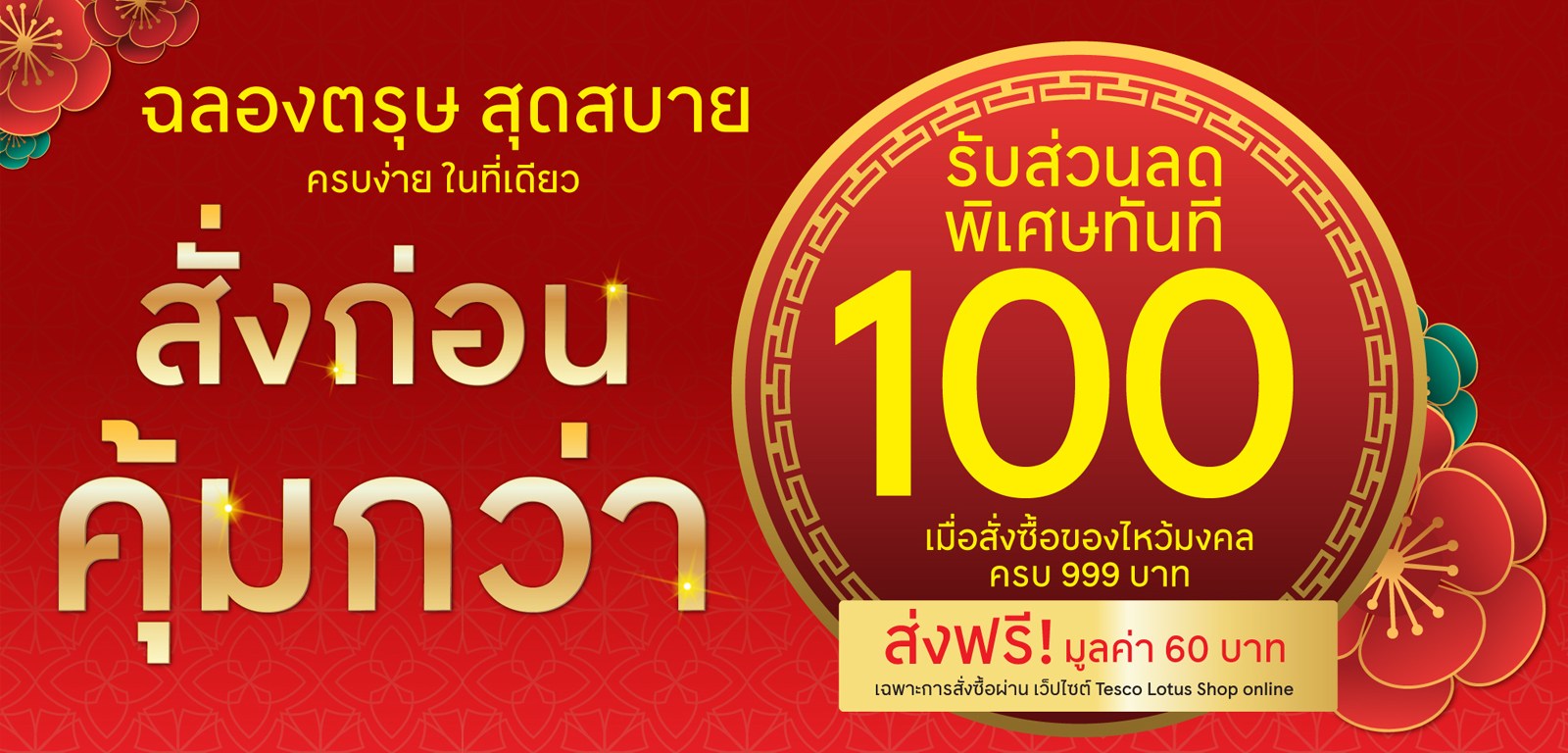 สั่งจองของไหว้เทษการตรุษจีนกับ เทสโก้ โลตัส สั่งก่อน คุ้มกว่า พร้อมรับส่วนลดพิเศษ 100 บาททันที มีช่องทางการสั่งได้ที่ สาขา ผ่านไลน์ และออนไลน์ โดยเปิดให้สั่งจองวันที่ 20 มกราคม – 3 กุมภาพันธ์ 2564 และรับสินค้าวันที่ 9 – 10 กุมภาพันธ์ 2564