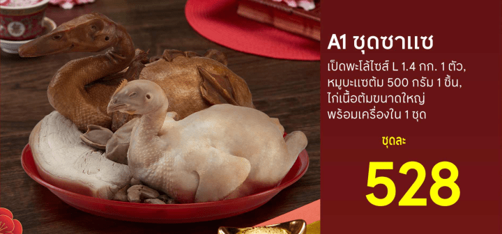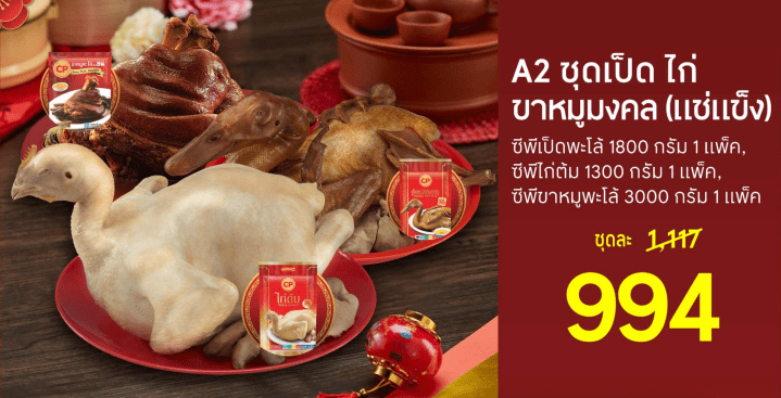 - A2 ชุดเป็ด ไก่ ขาหมูมงคล (แช่แข็ง) ชุดละ 994 บาท (ปกติ 1,117 บาท)