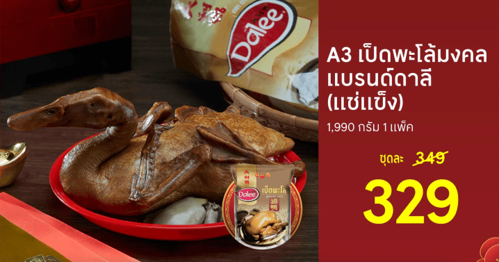 - A3 เป็ดพะโล้มงคลแบรนด์ดาลี (แช่แข็ง) 1,990 กรัม 1 แพ็ค ชุดละ 329 บาท (ปกติ 349 บาท)