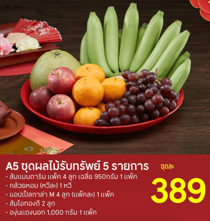 - A5 ชุดผลไม้รับทรัพท์ 3 รายการ ชุดละ 389 บาท